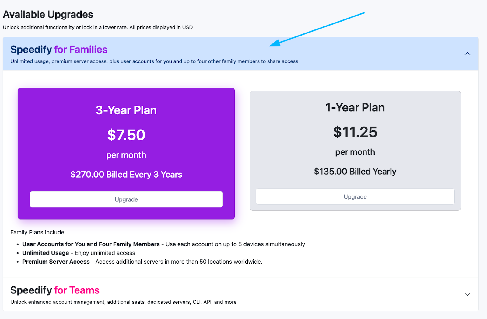 Upgrade from Speedify for Families Monthly to Speedify for Families 3- Yearly