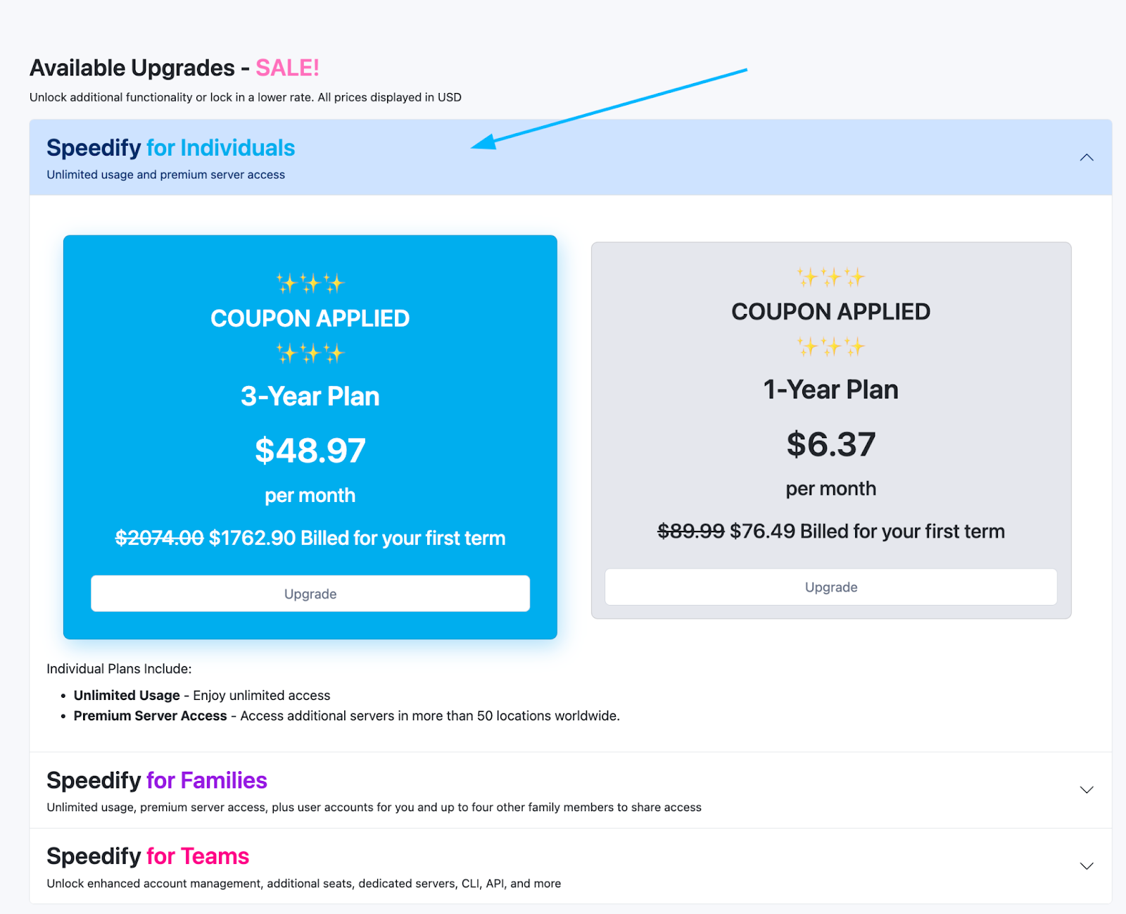 Upgrade from Speedify for Individuals Monthly to Speedify for Individuals 3-Year