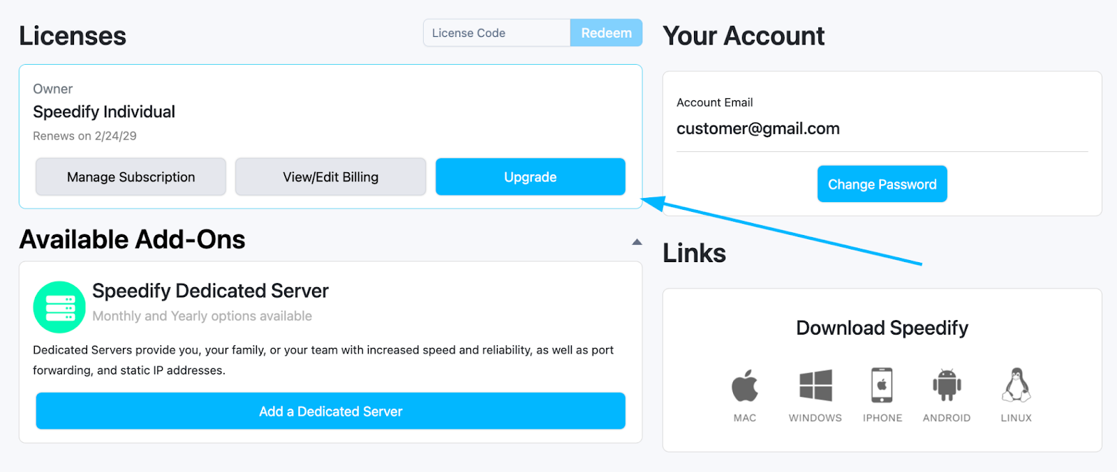 This article is for customers who purchased their Speedify subscription through the Speedify website and not the Apple App Store or Google Play Store. To upgrade a subscription made through a mobile store, follow the links below: