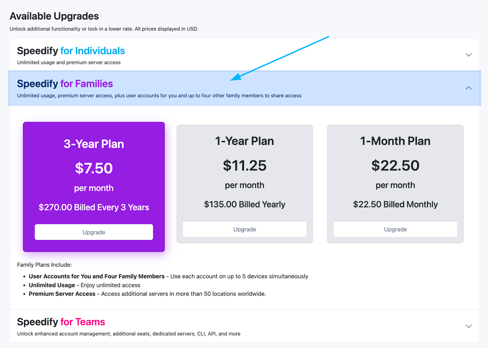 Upgrade from Speedify for Individuals Yearly to Speedify for Families