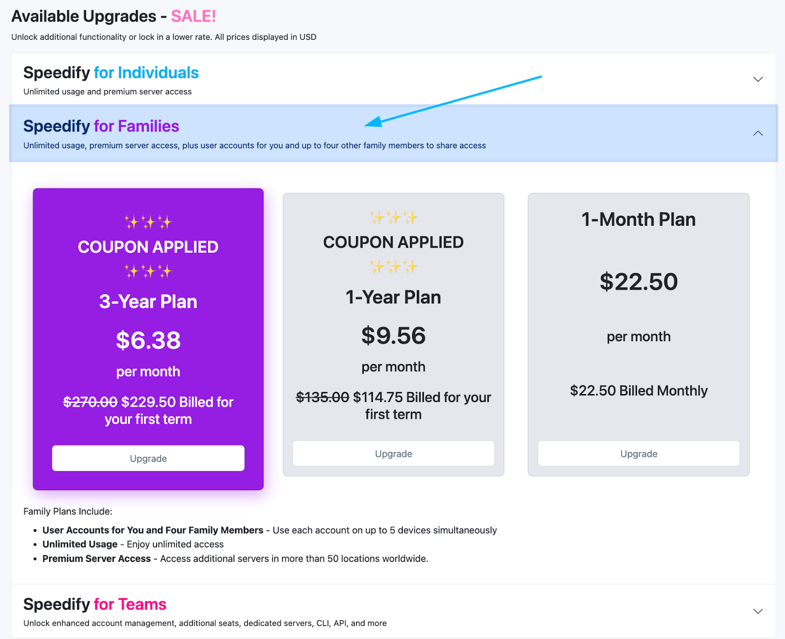 Upgrade from Speedify for Individuals Monthly to Speedify for Families