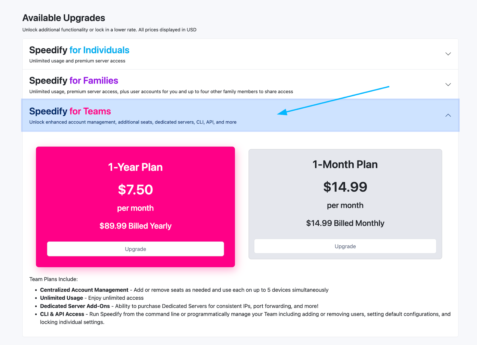 Upgrade from Speedify for Individuals Monthly to Speedify for Teams