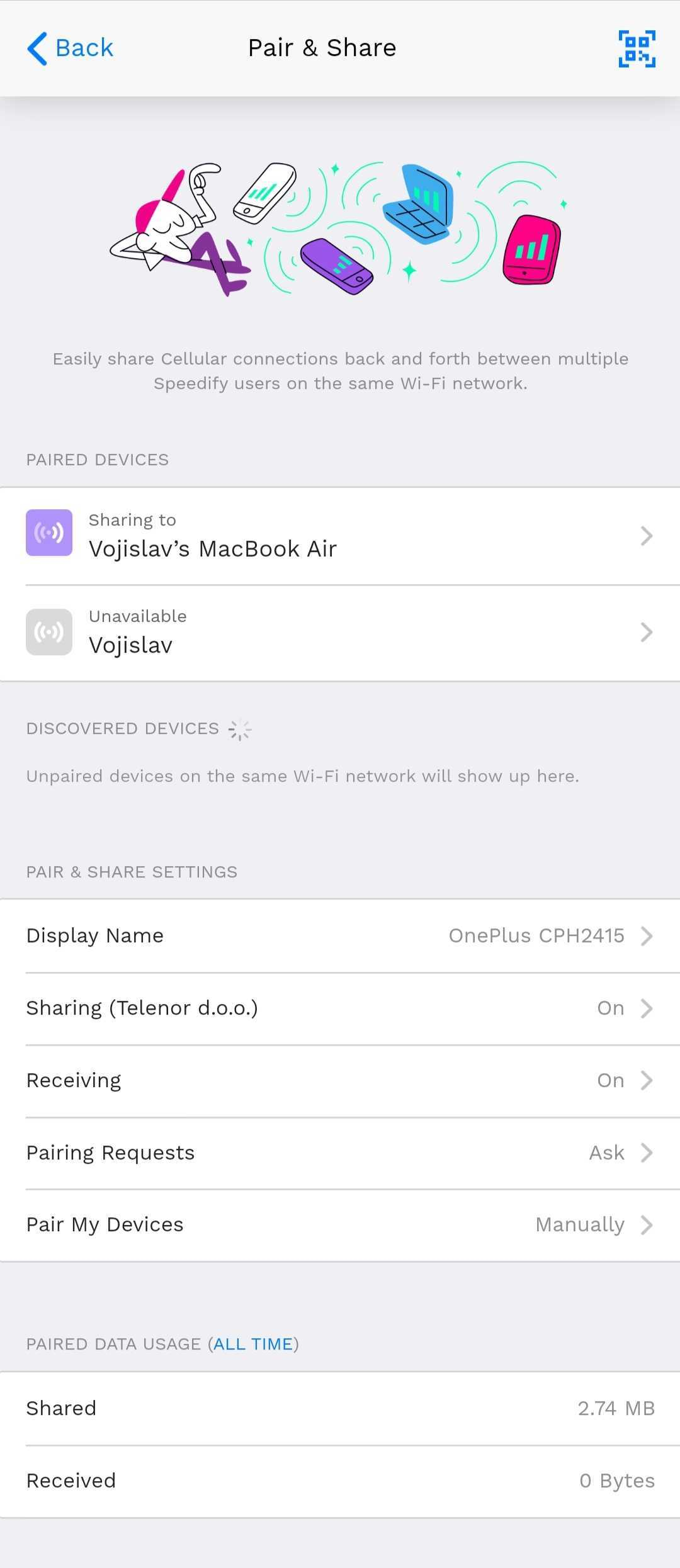 This article covers the settings available in Speedify's Pair & Share feature. Pair & Share lets Speedify users on the same local network wirelessly share and combine LTE, 4G, and 5G cellular connections back and forth between devices, giving everyone a faster, more reliable connection.