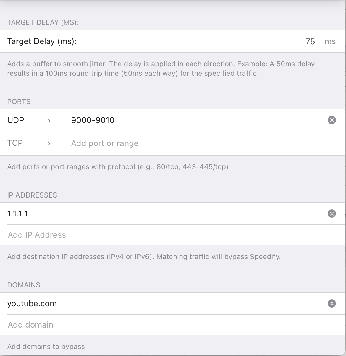 - Traffic Rules (Port, IP, Domain): Sets which traffic should use the Jitter Buffer. Traffic that does not match the rules is delivered normally without any extra delay. Rules can be set based on ports, IP addresses, or domains.
